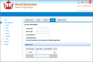 7. INVOICE – provide the invoice information such as invoice no. and amount in Brunei Dollar. Press Add Invoice To list once completed.