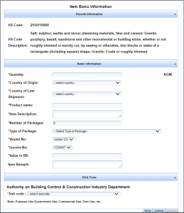 Once an HS Code is selected, do provide the necessary information regarding the item and once completed click the SAVE button.